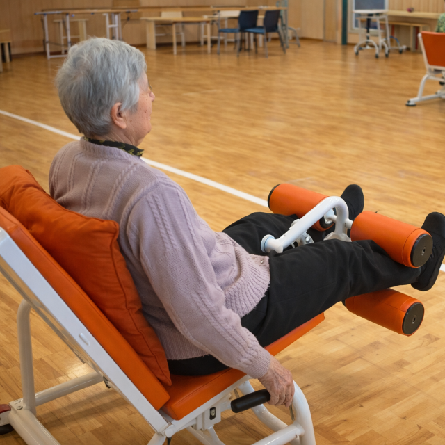 油圧マシンで生活動作能力を支える基礎的体力の低下を抑え、総合的な機能を維持し、また、広いフロアを使い歩行能力の向上を目指します。